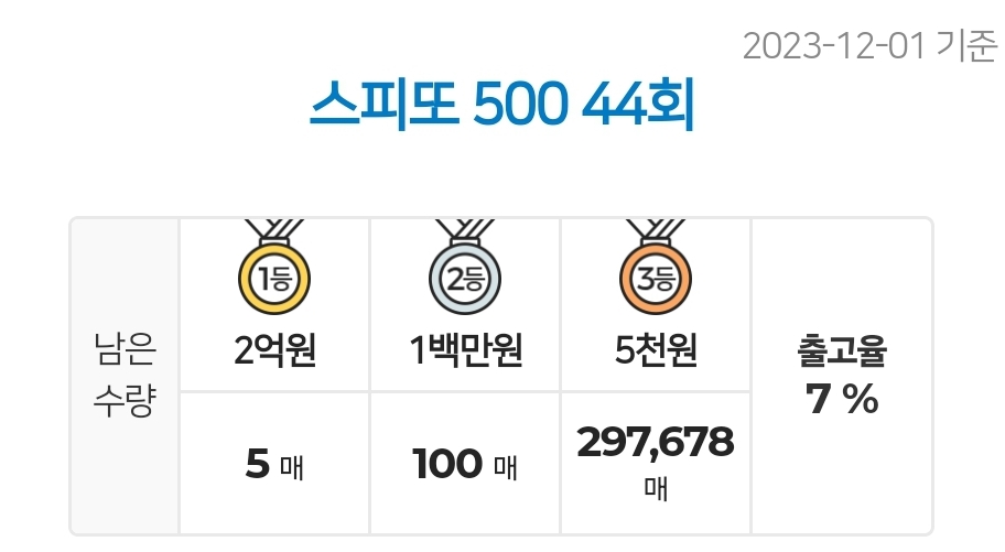 (2023.12.01기준) 스피또500 44회 출고율 / 스피또500 44회 당첨현황