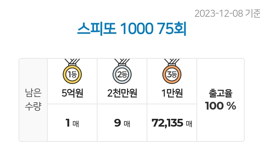 (2023.12.08 기준) 스피또1000 75회 출고율 / 스피또1000 75회 당첨현황