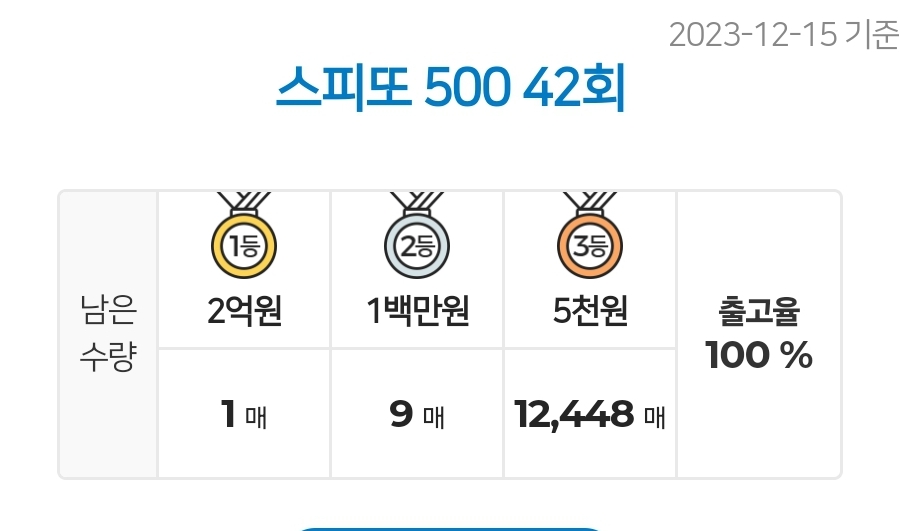 (2023.12.15 기준) 스피또500 42회 출고율 / 스피또500 42회 당첨현황
