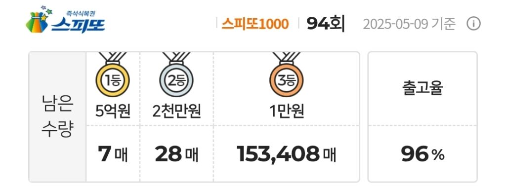 스피또1000 복권 94회 남은수량 1등 7매(총 9매 중), 2등 28매(총 45매 중), 3등 153,408매(총 247,500매 중)가 남아 있습니다. 출고율(판매점 입고율)은 96%입니다. 출고율의 의미와 당첨확률을 높이는 방법은 스피또 당첨확율을 높이는 방법은? 구입전에 출고율과 남은 수량을 확인은 필수! 글을 참고하세요.