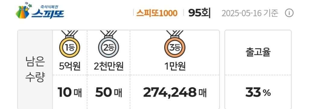 스피또1000 복권 95회 남은수량 1등 10매(총 10매 중), 2등 50매(총 50매 중), 3등 275,000매(총 274,248매 중)가 남아 있습니다. 출고율(판매점 입고율)은 33%입니다. 출고율의 의미와 당첨확률을 높이는 방법은 스피또 당첨확율을 높이는 방법은? 구입전에 출고율과 남은 수량을 확인은 필수! 글을 참고하세요.