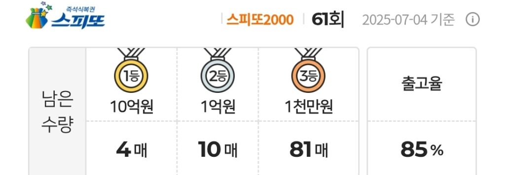 스피또2000 즉석복권 61회 남은수량 1등 4매(총 6매 중), 2등 13매(총 18매 중), 3등 81매(총 150매 중)가 남아있습니다. 출고율(판매점 입고율)은 85%입니다.