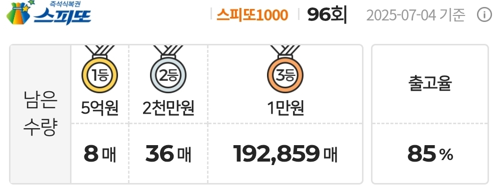 스피또1000 복권 96회 남은수량 1등 8매(총 10매 중), 2등 36매(총 50매 중), 3등 192,859매(총 275,000매 중)가 남아 있습니다. 출고율(판매점 입고율)은 85%입니다.