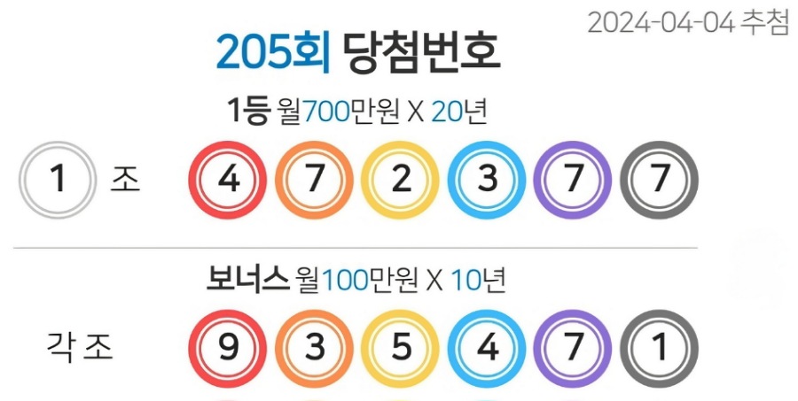 205회 연금복권 720 당첨번호 및 당첨판매점 정보 (2024년 4월 4일 추첨)
