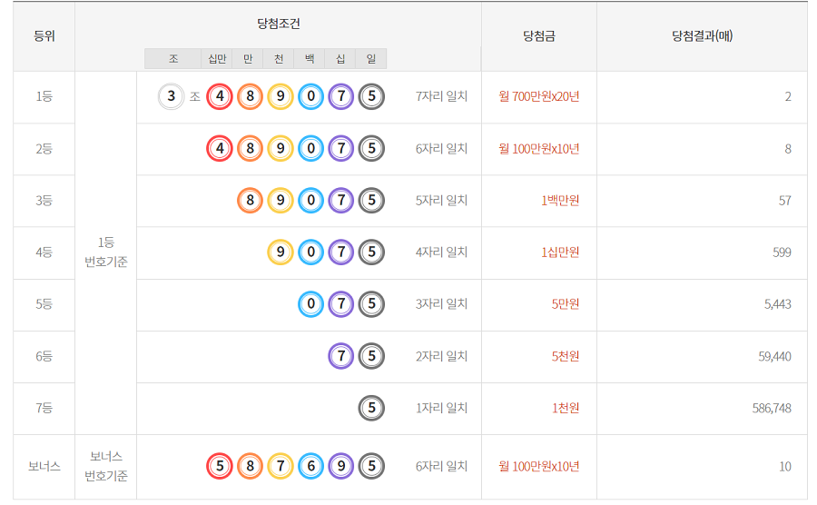 보너스 번호 기준 당첨자와 2등 당첨자는 10년간 매월 100만원을 지급받게 됩니다.