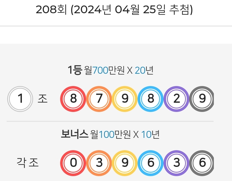 제 208회 연금복권 720 1등 당첨번호는 1조 879829입니다.