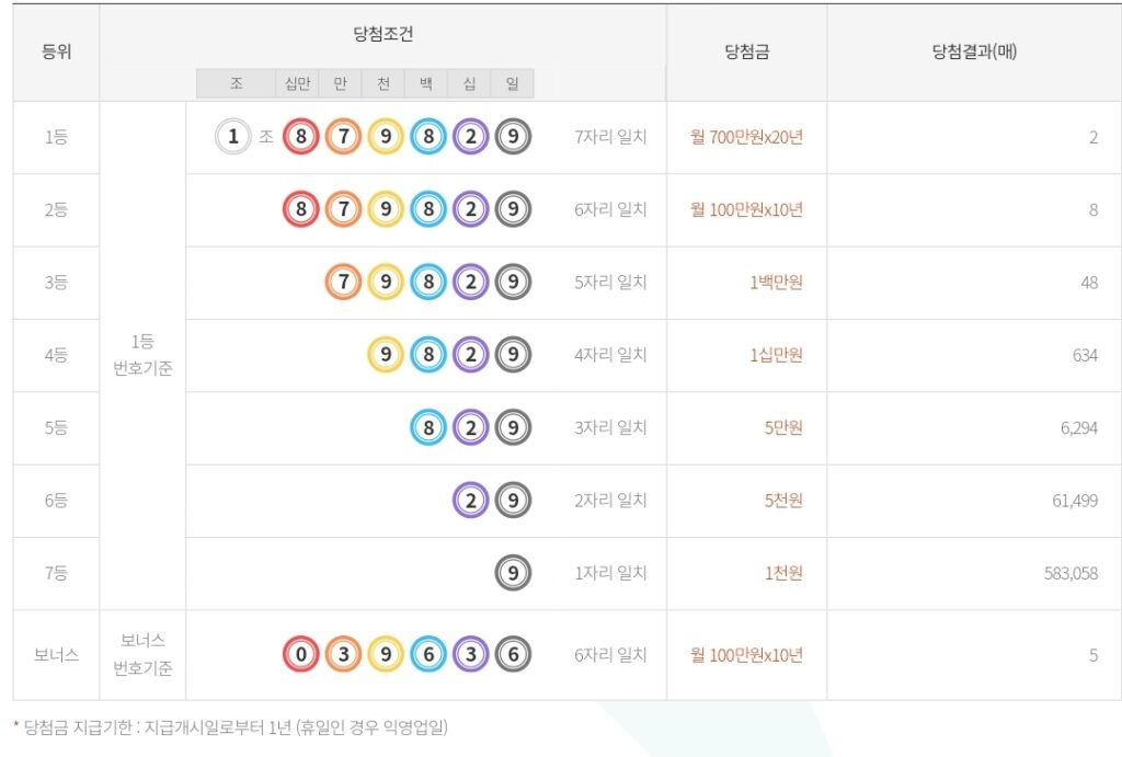 - 연금복권 720+당첨금은 등수별로 중복되는 경우에도 모두 수령 가능하며, 지급 개시일로부터 1년이며, 휴일인 경우 익영업일입니다.