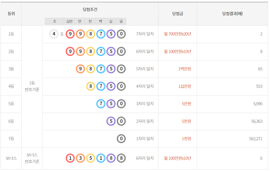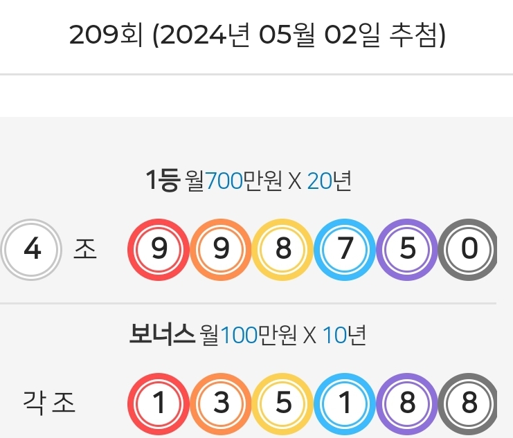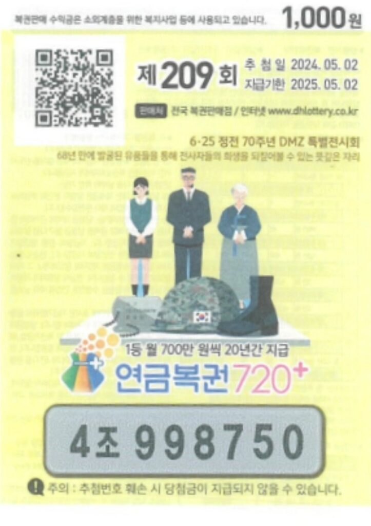 제 209회 연금복권 720 1등 당첨번호는 4조 998750입니다.