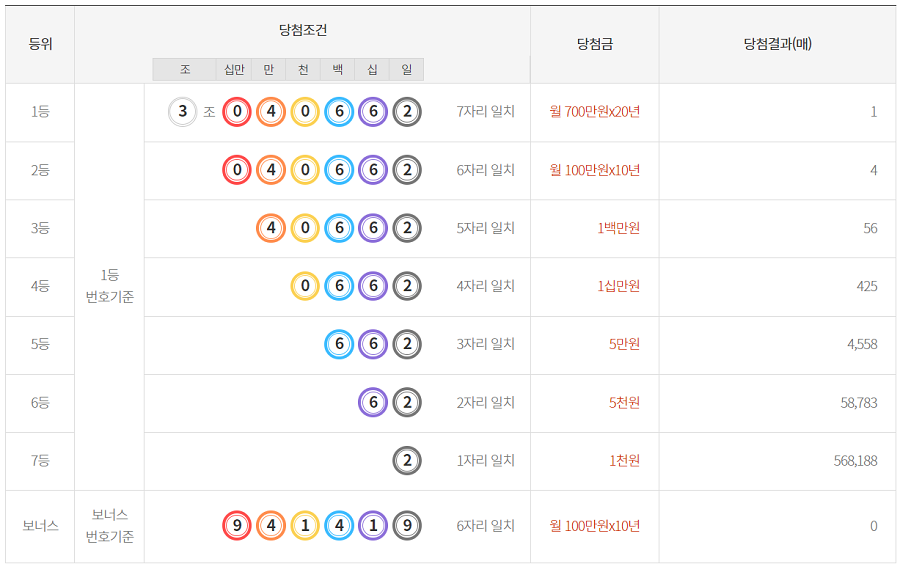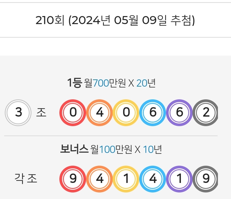 제 210회 연금복권 720 1등 당첨번호는 3조 040662입니다.