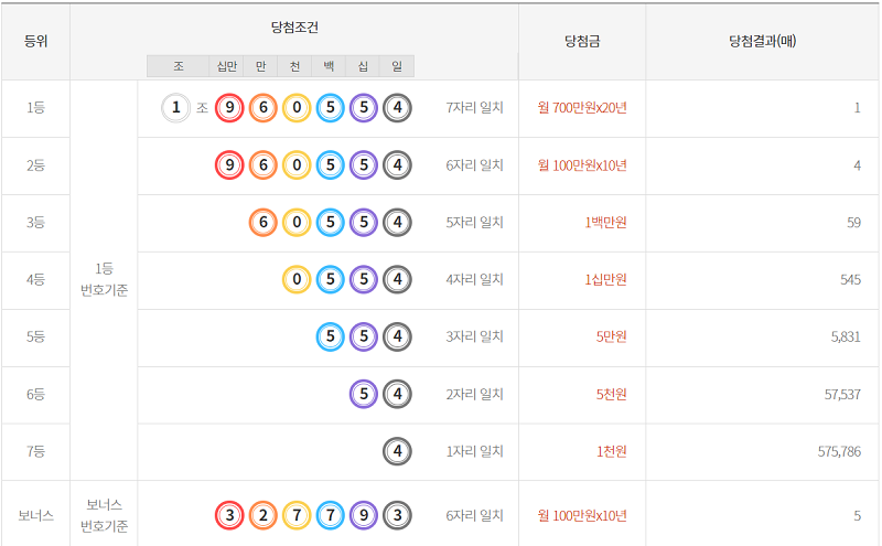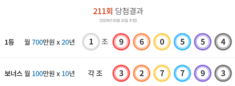 제 211회 연금복권 720 1등 당첨번호는 1조 960554입니다.
