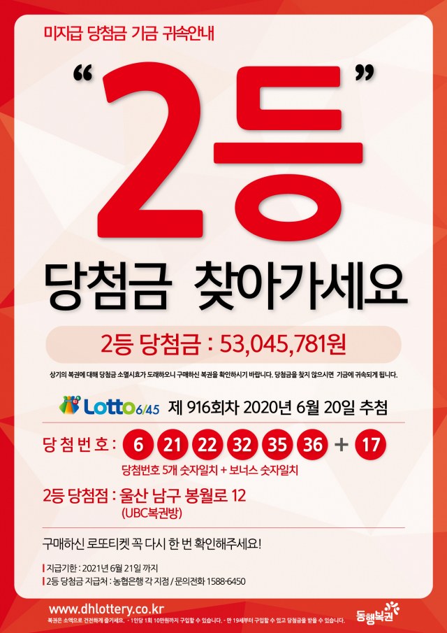 916회차 2등 미수령 금액은 5,304만5,781원이다. 2등 당첨번호는 ‘6, 21, 22, 32, 35, 36과 보너스 번호 17’이며, 로또복권을 구입한 장소는 울산 남구 봉월로에 위치한 복권판매점이다.