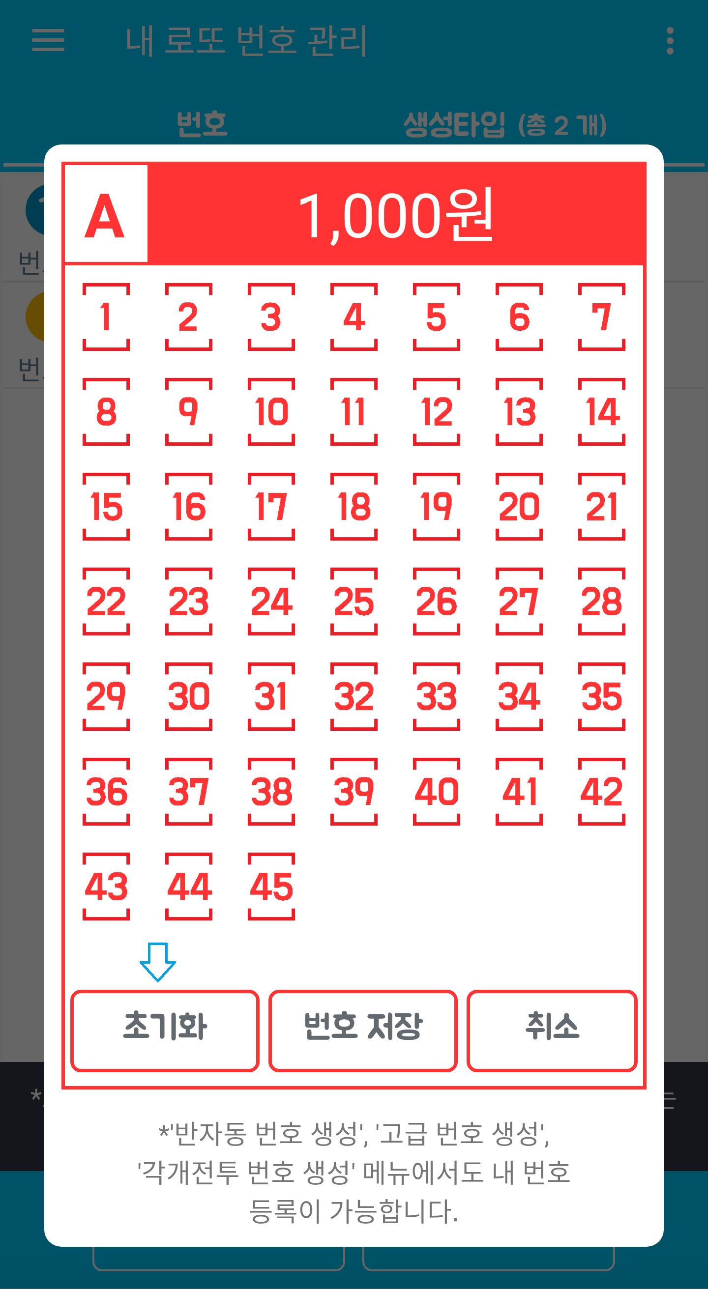 3.내 로또 번호 관리 메뉴에서 “직접등록” 기능을 사용시, 번호저장 후 선택한 번호를 초기화 하기 위해 다시 체크 해제해야하는 불편함을 해소하기위해 “초기화”버튼을 추가하였습니다.