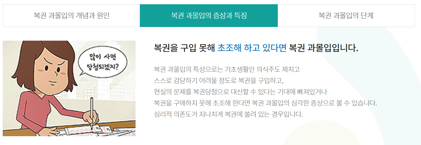 | 시간과 돈의 한계를 넘어 스스로 감당할 수 없으면 복권 과몰입입니다. 지속적으로 복권과 관련한 생각과 말을 하고, 현재의 금전적 어려움이나 잃은 돈을 복권당첨으로 회복할 수 있다고 믿습니다. 심지어 복권구매 때문에 가족 및 대인관계에 갈등이 생기고, 자신의 의지로 구매행위를 조절하지 못해 시간과 돈의 한계를 넘어섰다면 도박 중독 또는 복권 과몰입으로 봐야합니다. |