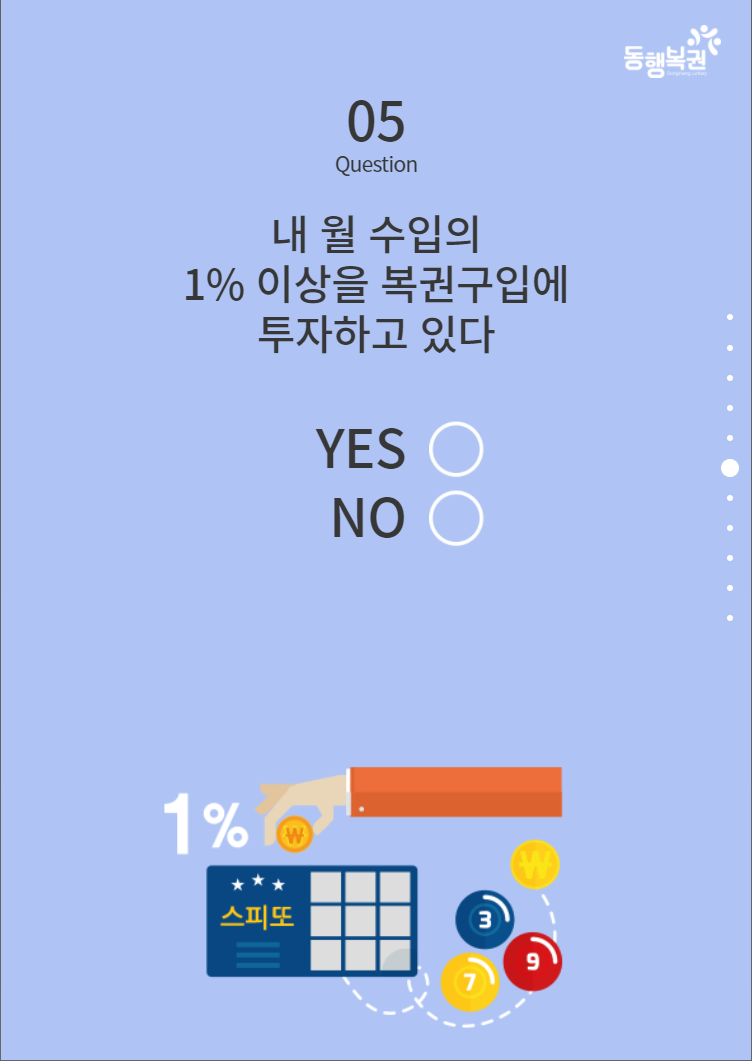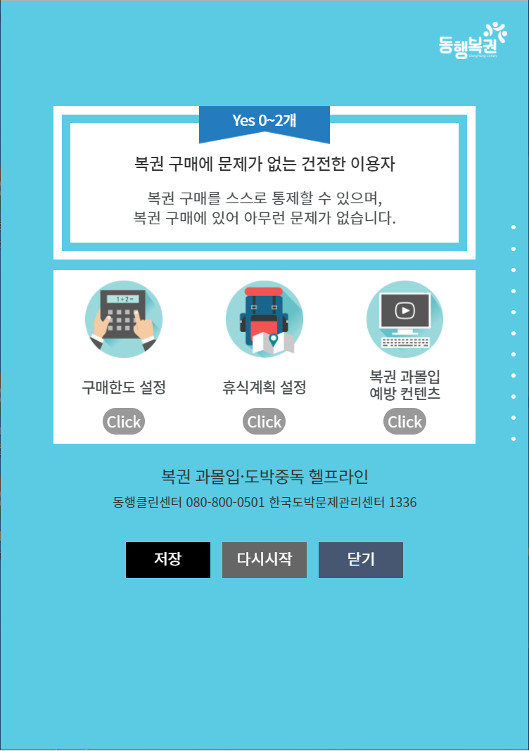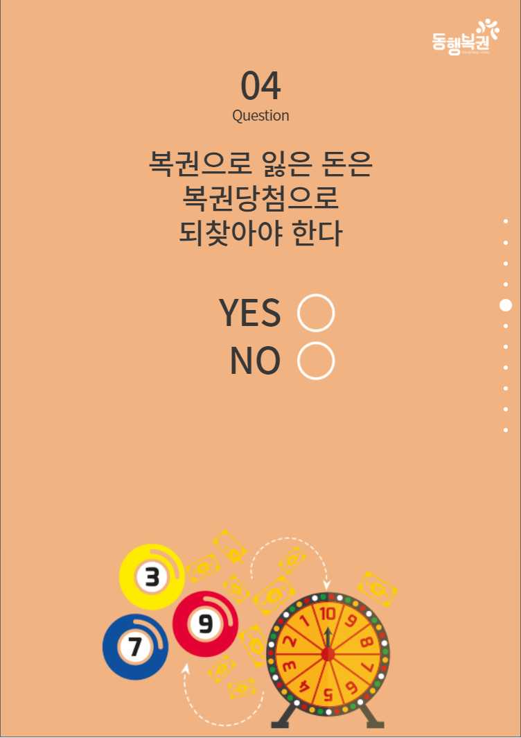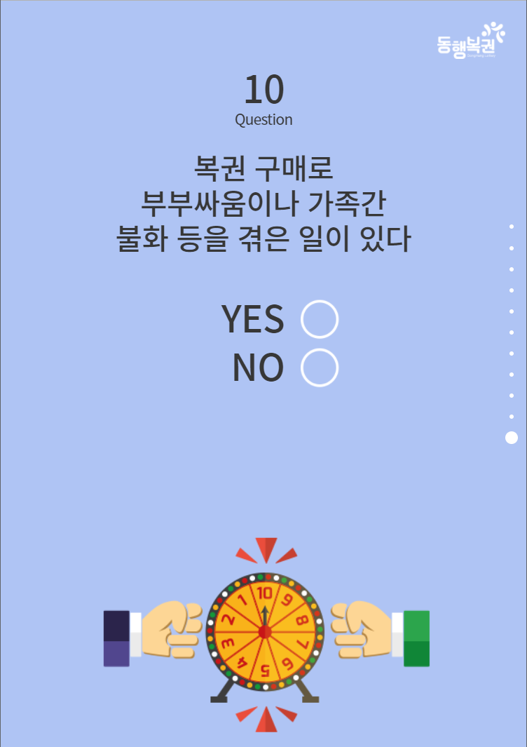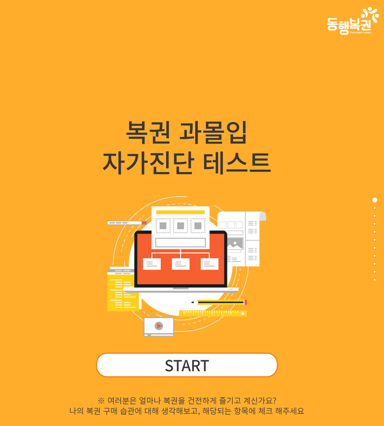 복권은 한 주간 희망을 심어주는 가벼운 여가활동이자,도움이 필요한 이웃을 위한 나눔입니다. 그러나 복권에 과도하게 몰입하게 되면 나와 내 주위의소중한 사람들에게 상처와 고통을 줄 수도 있습니다.평소 주기적인 자기진단을 통해 스스로의 복권 과몰입 상태를 점검해 보세요.