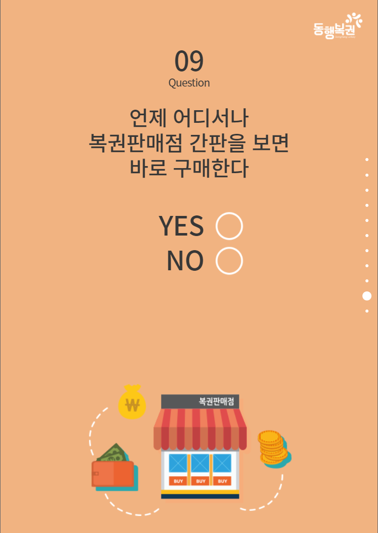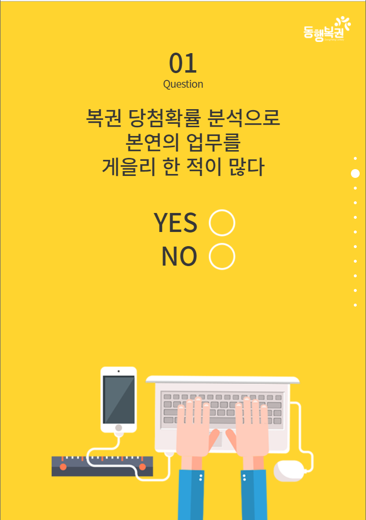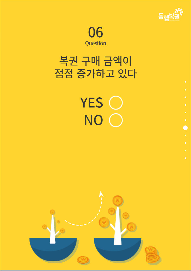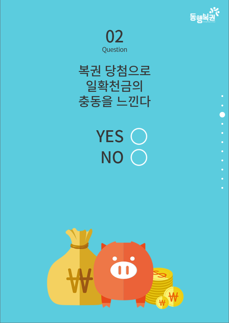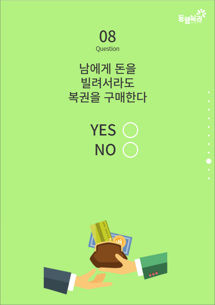 복권은 한 주간 희망을 심어주는 가벼운 여가활동이자,도움이 필요한 이웃을 위한 나눔입니다. 그러나 복권에 과도하게 몰입하게 되면 나와 내 주위의소중한 사람들에게 상처와 고통을 줄 수도 있습니다.평소 주기적인 자기진단을 통해 스스로의 복권 과몰입 상태를 점검해 보세요.