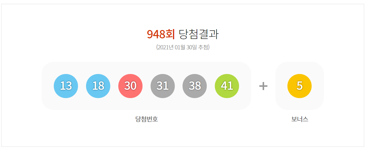 948회 로또 추첨번호는 13,18,30,31,38,41 입니다. 보너스 번호는 5입니다.