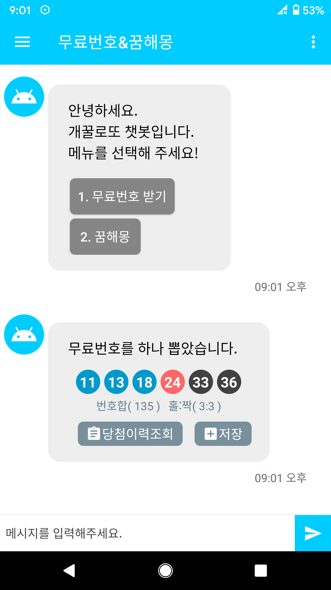 다른 한 게임은 개꿀로또 챗봇으로 부터 무료번호를 받아서 합니다.