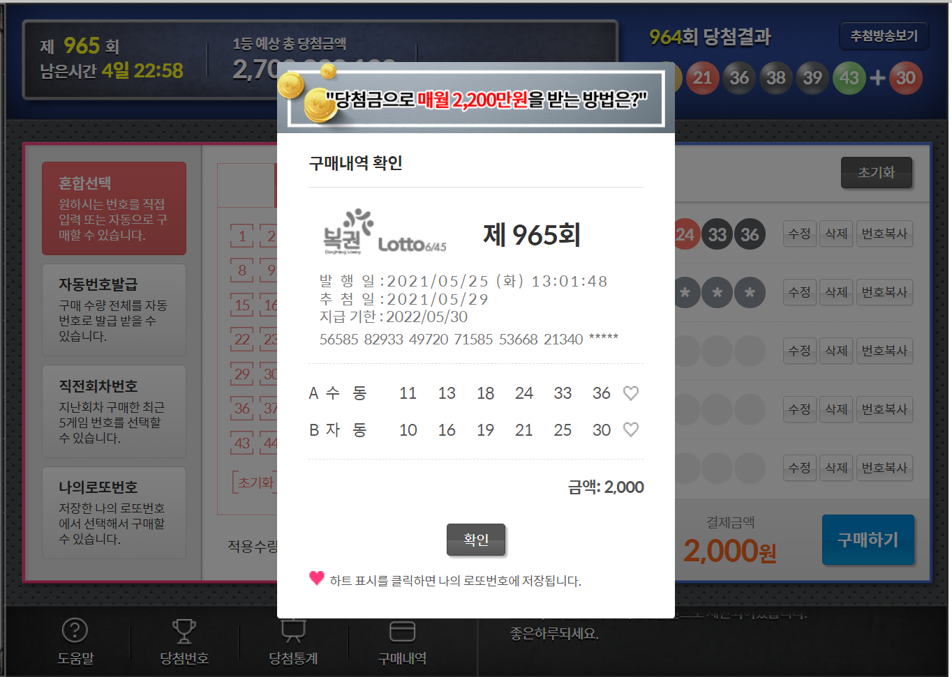 이번주 965회차 로또 번호를 구입했습니다.