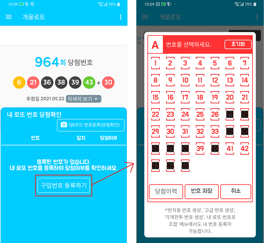 1. 앱 메인화면의 “구입번호 등록하기” 클릭시 당첨이력 버튼 기능 체크 누락을 수정 및 선택 번호 최대 6개만 선택가능하도록 하는 기능 누락을 수정하였습니다. 새로운 메인화면 스타일(UI)을 사용하시는 분들은 문제 없습니다.