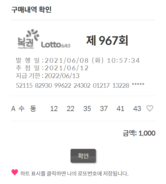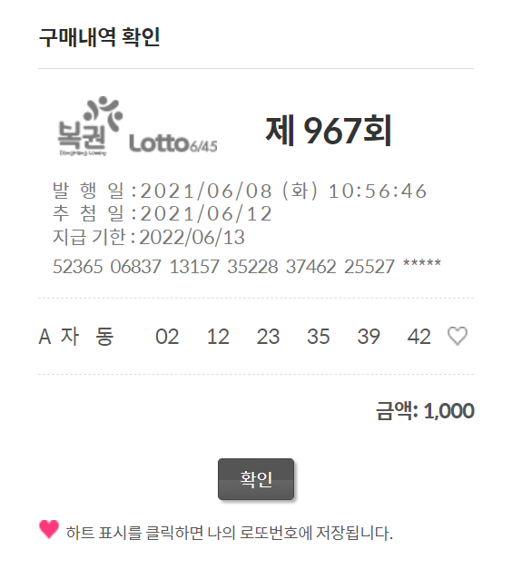 이번주 로또 967회 번호를 구입했습니다. 온라인 동행복권 사이트에서 구매를 하고 있어요.