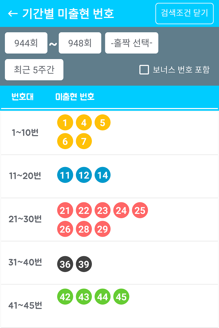 최근 5주간 미출현번호( 보너스 번호 포함)