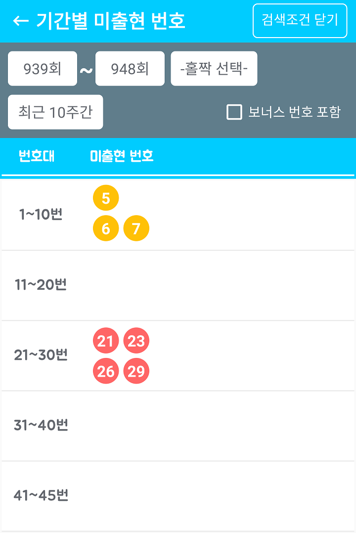 최근 10주간 미출현번호( 보너스 번호 포함)