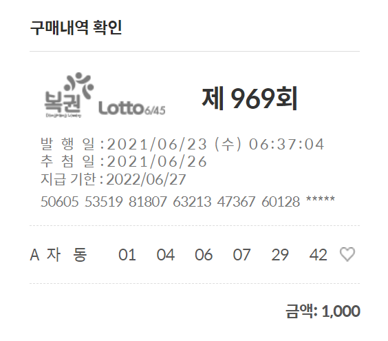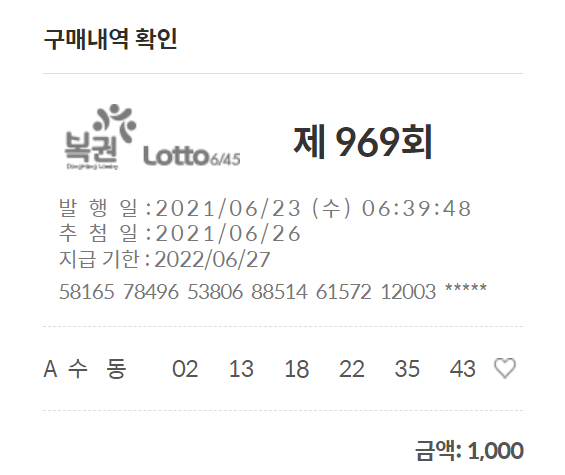 이번주 로또 969회 번호를 구입했습니다. 온라인 동행복권 사이트에서 구매를 하고 있어요.