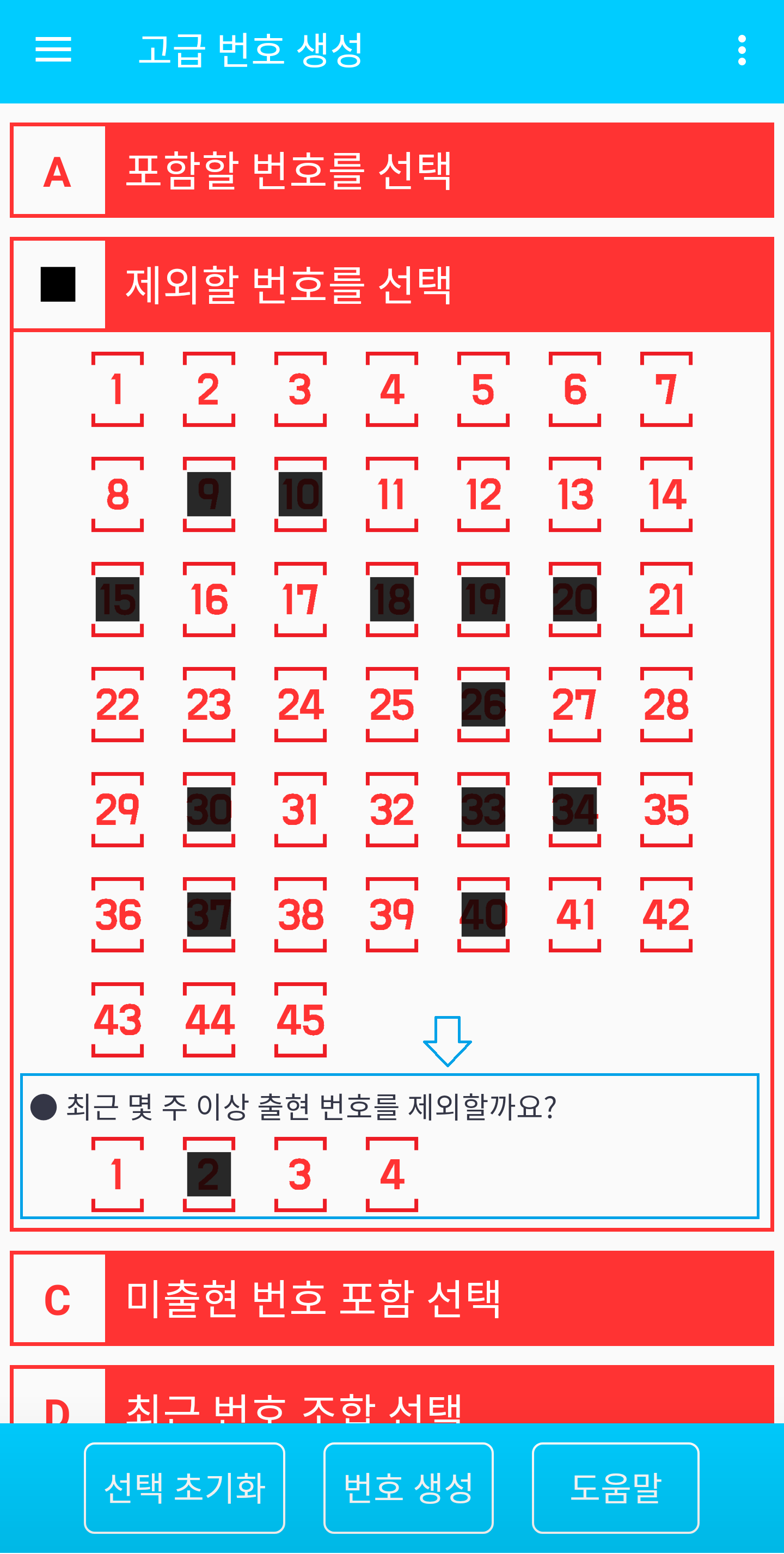 1.고급 번호 생성 메뉴에 제외할 번호 선택시 자동 제외선택 기능이 추가되었습니다. “최근 몇 주 이상 출현 번호를 제외할까요?” 항목에서 최대 4주까지 제외 가능합니다.