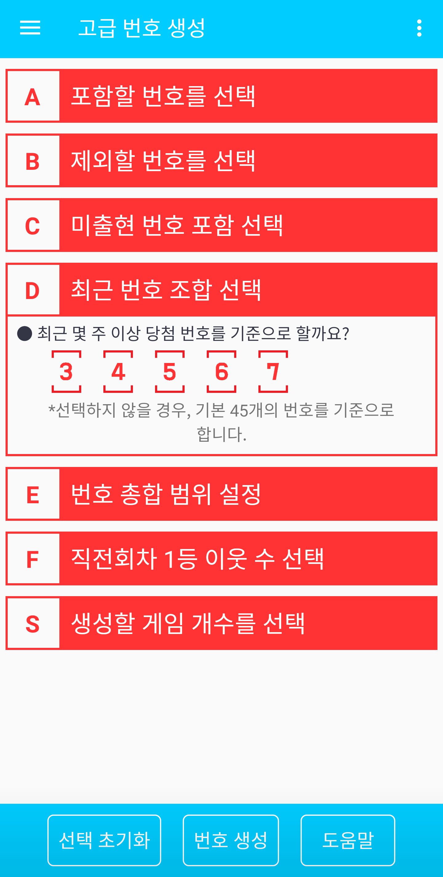 2.고급 번호 생성메뉴에 “최근 번호 조합 선택” 기능이 추가되었습니다. 최근 몇 주 이상 당첨 번호를 기준으로 할까요? 가령, 5주를 선택한다면, 가장 최근 5주에 당첨되었던 당첨번호들 중에서 번호를 조합하여 생성합니다.