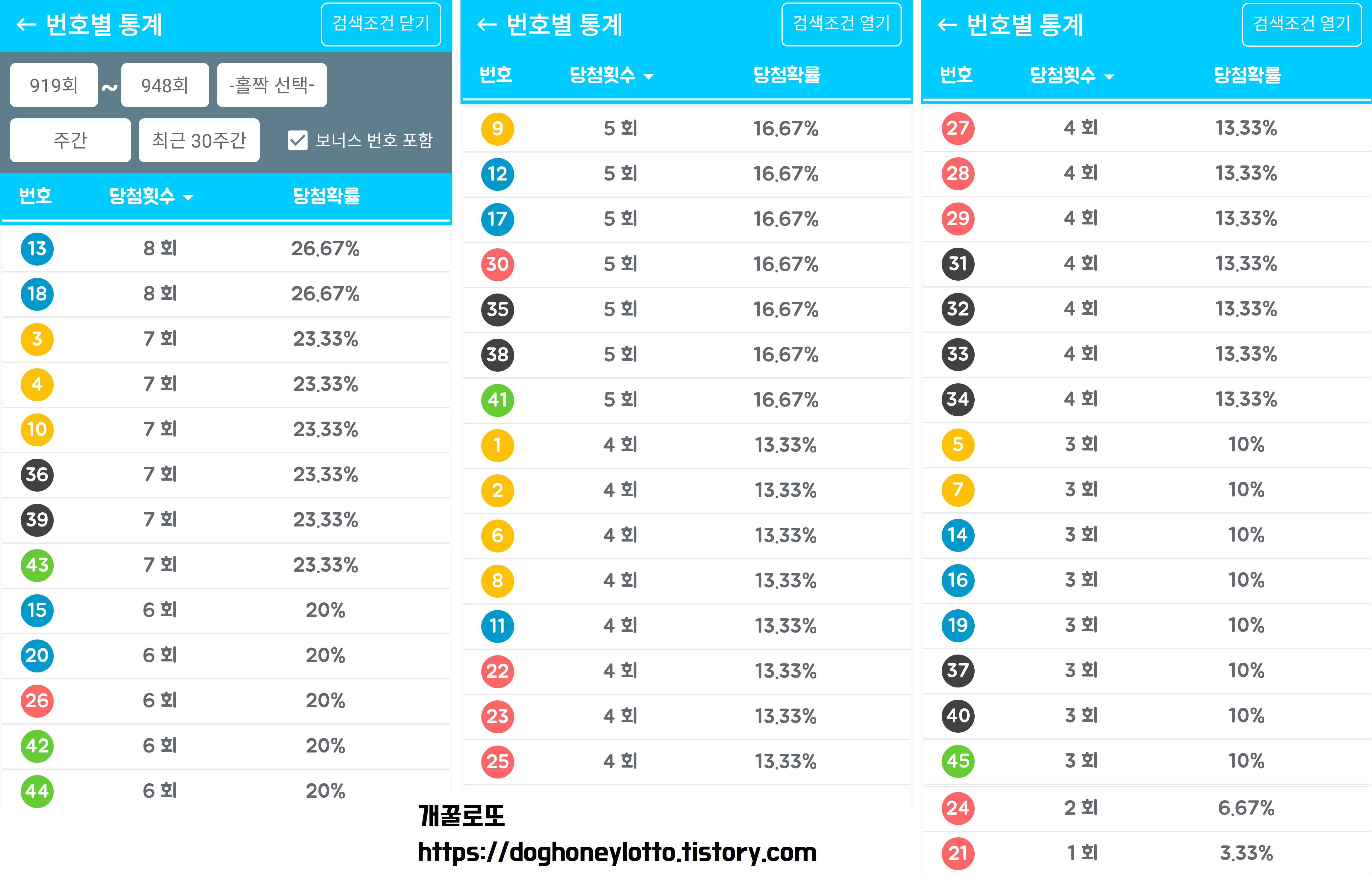 이번주 로또(lotto 645) 949회 예상 당첨번호 조합을 위해 로또 1회~948회까지의 데이터를 기반으로 당첨번호별 당첨 횟수 (출현 횟수 ) 분석 및 당첨확률을 분석하였습니다. 개꿀로또앱의 로또 분석 및 통계 > 번호별 통계 메뉴를 이용하시면 더 많은 조건 필터로 분석이 가능합니다.