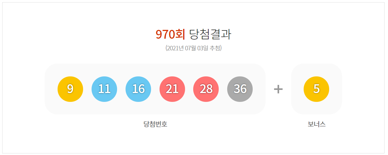 970회 당첨번호(추첨번호)는 9,11,16,21,28,36 이며, 보너스 번호는 5입니다.