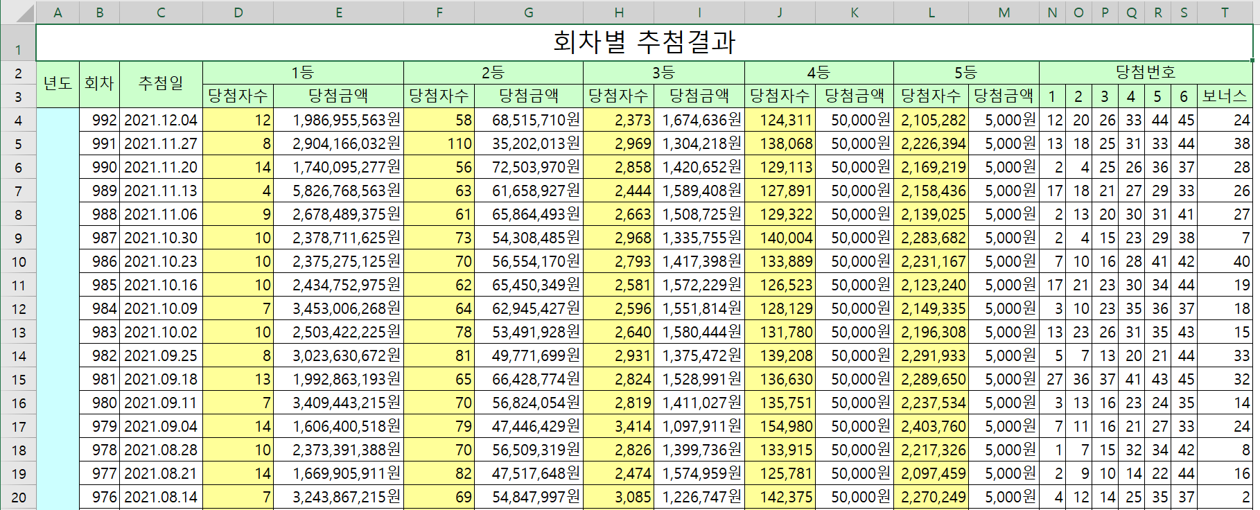 2002년도 부터 2021년도까지 1회차 부터 992회차까지 포함되어 있습니다.