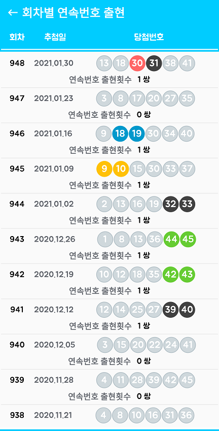 947회차에는 연속번호 출현이 없었습니다. 그러나 948회차에 연속 번호 1쌍이 출현하였습니다. 연속번호는 30, 31번 입니다. 30번대 연속 번호가 출현하였는데요. 949회차에는 혹시 20번대가 출현할까요? 31주째 20번대 연속번호가 출현하고 있지않습니다. 938회차 이하의 회차별 연속번호 출현 정보가 궁금하시면 개꿀로또앱을 설치 후 이용해보세요.