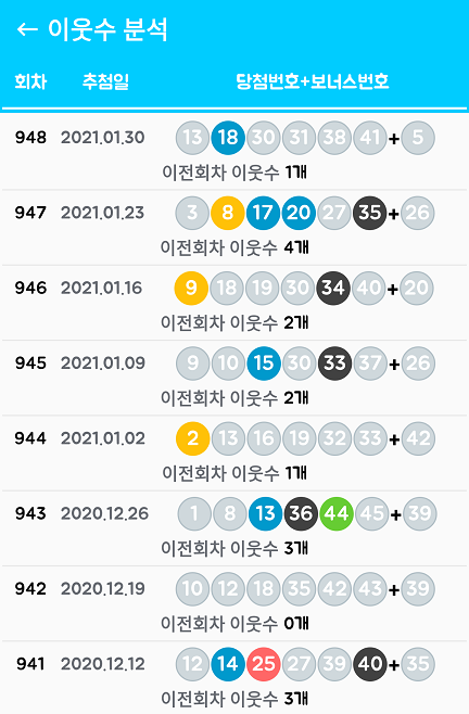 948회차에 947회차의 이웃수 18번이 출현하였습니다. 5주 연속 이웃수가 출현 중입니다. 이전 회차의 이웃수를 추가하는 것이 949회차 로또 당첨 확률을 높이는 길이 아닐까 생각해봅니다. 949회차 대상 이웃수는 12, 14, 17, 19, 29, 30, 32, 37, 39, 40, 42번 입니다. 보너스 번호 포함할 경우 4번과 6번이 이웃수에 추가됩니다.