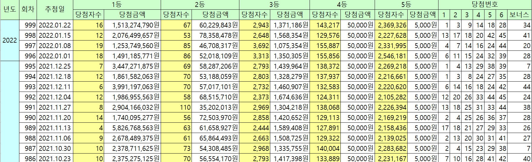 2002년도 부터 2022년도까지 1회차 부터 999회차까지 포함되어 있습니다.