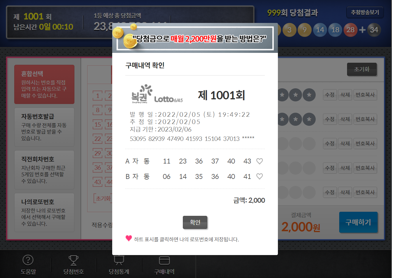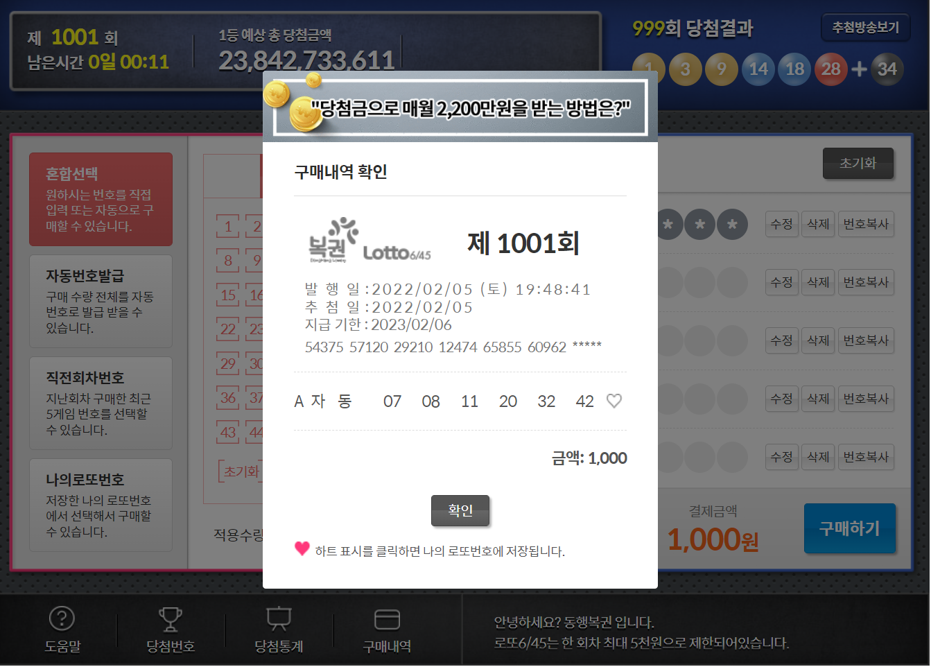 이번주 로또 1001회 로또를 구입했습니다.