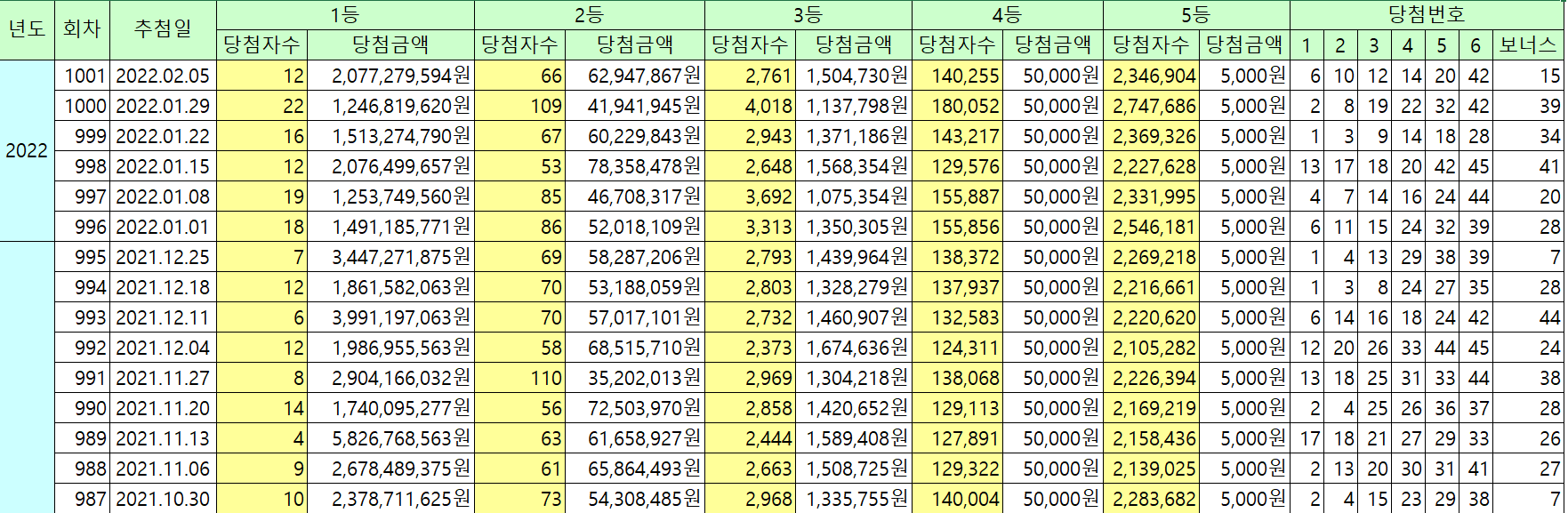 년도별, 회차, 추첨일, 1등 당첨자수, 1등 당첨금액, 2등 당첨자수, 2등 당첨금액, 3등 당첨자수, 3등 당첨금액, 4등 당첨자수, 4등 당첨금액, 5등 당첨자수, 5등 당첨금액, 당첨번호, 버너스 번호 등의 정보를 모두 포함합니다.
