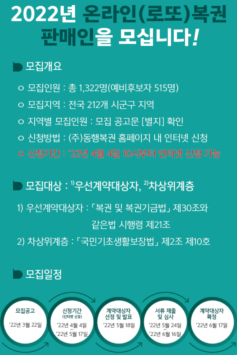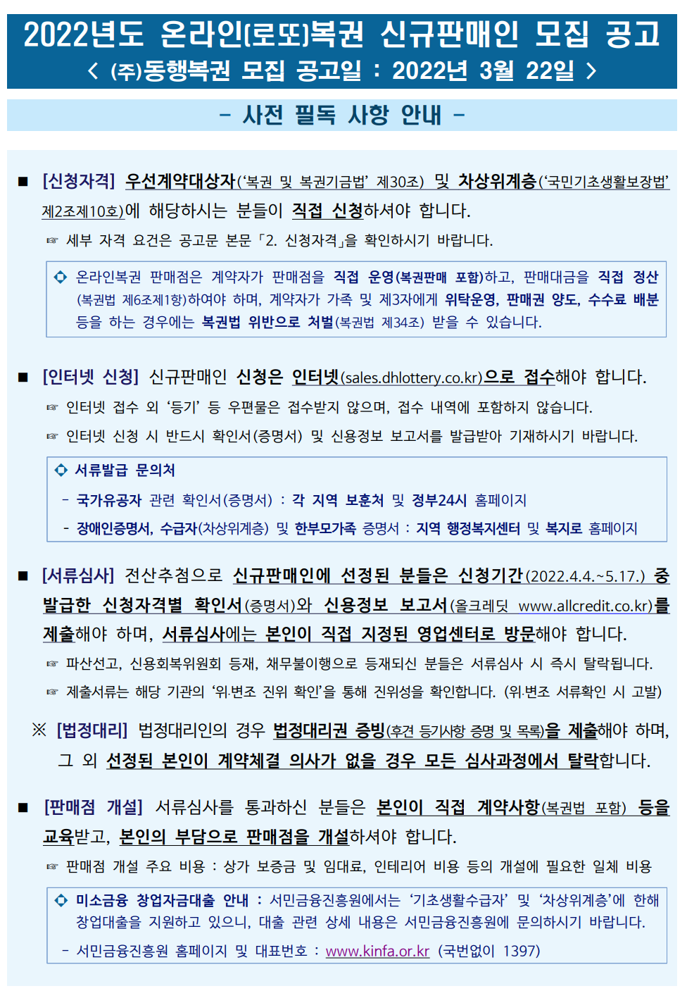 2) 신청방법 : ㈜동행복권 홈페이지 내 「판매인 모집공고」를 통한 인터넷 신청
