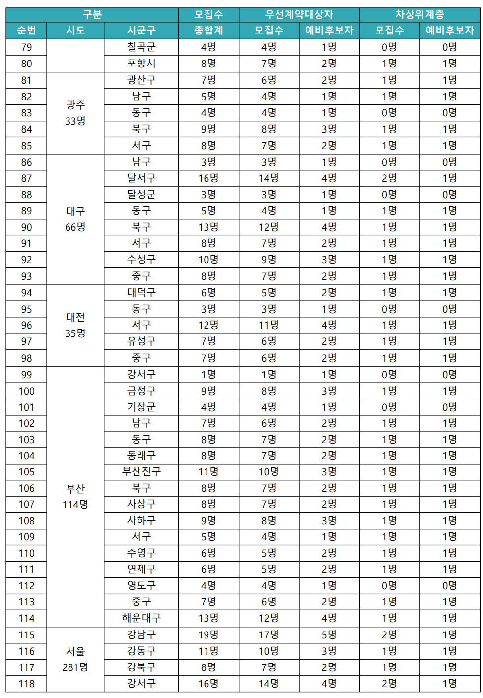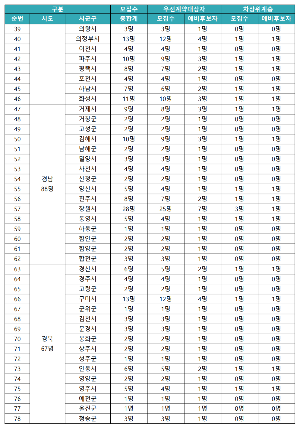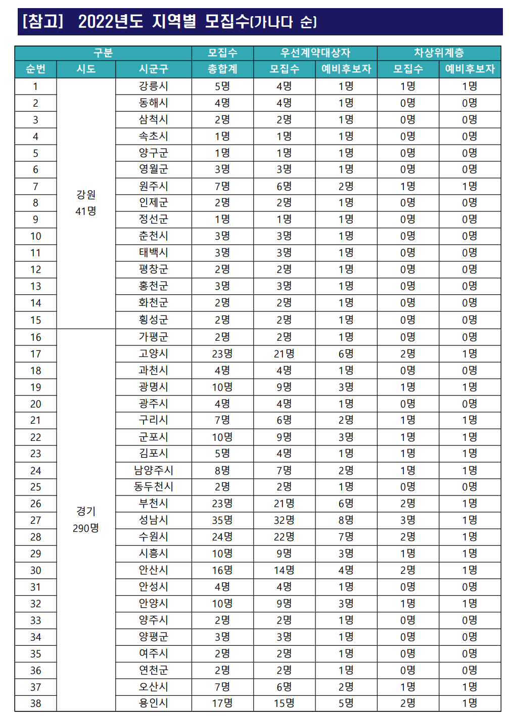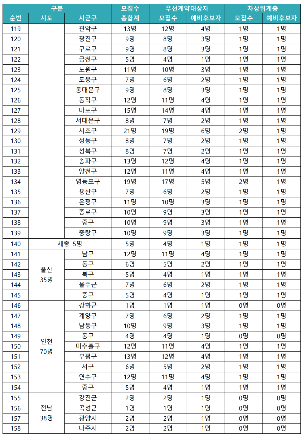 * 차상위계층은 지역별 모집수의 10%를 별도 배정하여 선정