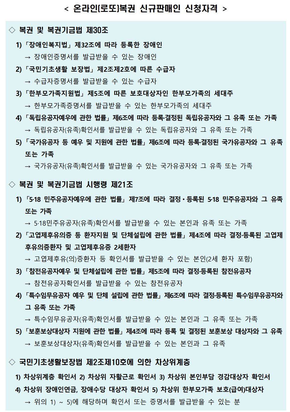 라. 로또복권 계약자는 로또복권 판매수익 발생에 따라 관련 법률 및 조례에 의한 각종 수급자 혜택(기초생활수급 관련 급여, 의료비감면 등) 지원 대상에서 제외되거나 지원금이 감소될 수 있습니다.