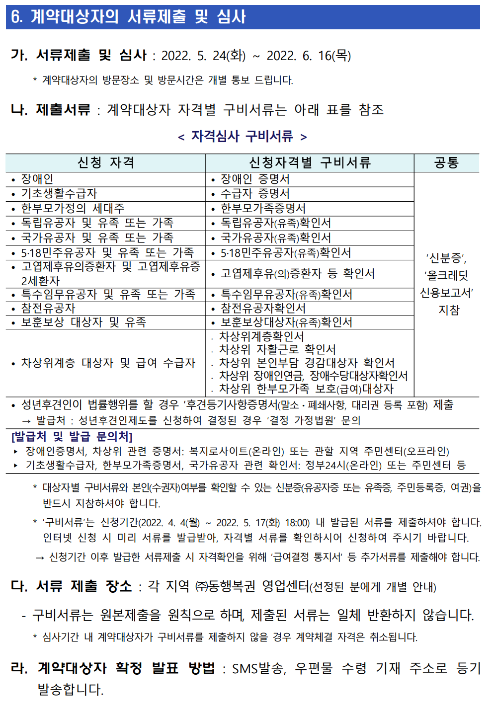 3) 신청단계에서 기재사항 누락, 연락 불능, 자격요건 미비 등으로 인해 계약자격이 상실될 경우 불이익은 신청자의 책임이므로 상세 내용을 반드시 확인해야 합니다.
