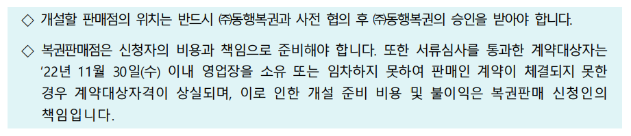 ㅇ 계약대상자는 2022년 12월 31일 18시까지 복권판매가 가능한 영업장을 소유하거나 임차(임대차계약서 구비)하여 ㈜동행복권과 판매장비 설치와 계 약체결을 완료하셔야 합니다.