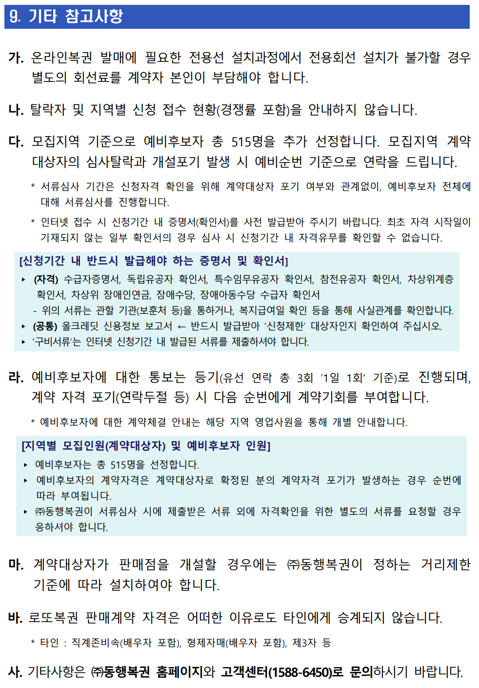 아. 로또복권 계약자가 판매점을 개설하는 과정에서 자격상실, 사망, 신청자 의사에 따른 포기(일정 미준수) 등에 따라 계약이 종료될 경우 귀책사유는 계약대상자에게 있습니다.