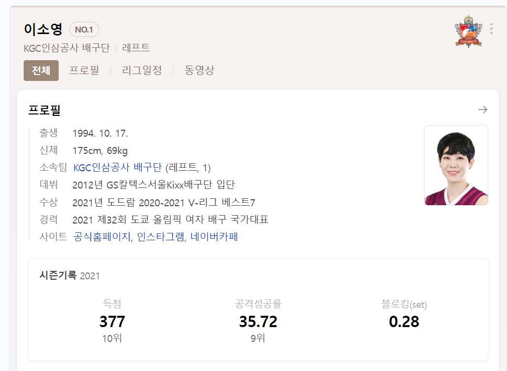 정답은 바로 KGC인삼공사 소속 배구선수 이소영입니다.