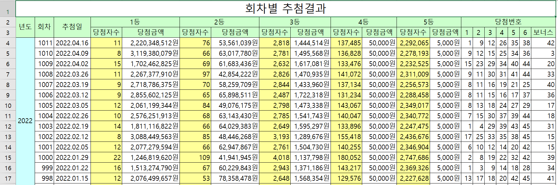 년도별, 회차, 추첨일, 1등 당첨자수, 1등 당첨금액, 2등 당첨자수, 2등 당첨금액, 3등 당첨자수, 3등 당첨금액, 4등 당첨자수, 4등 당첨금액, 5등 당첨자수, 5등 당첨금액, 당첨번호, 버너스 번호 등의 정보를 모두 포함합니다.