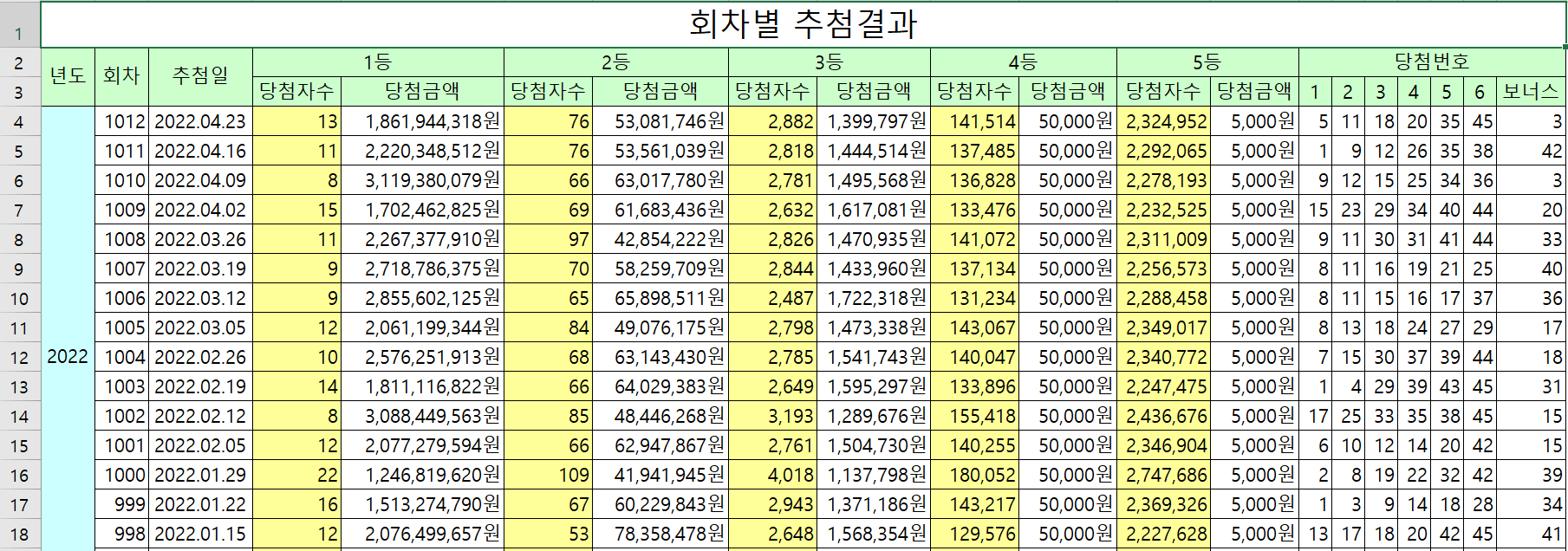 2002년도 부터 2022년도까지 1회차 부터 1012회차까지 포함되어 있습니다.
