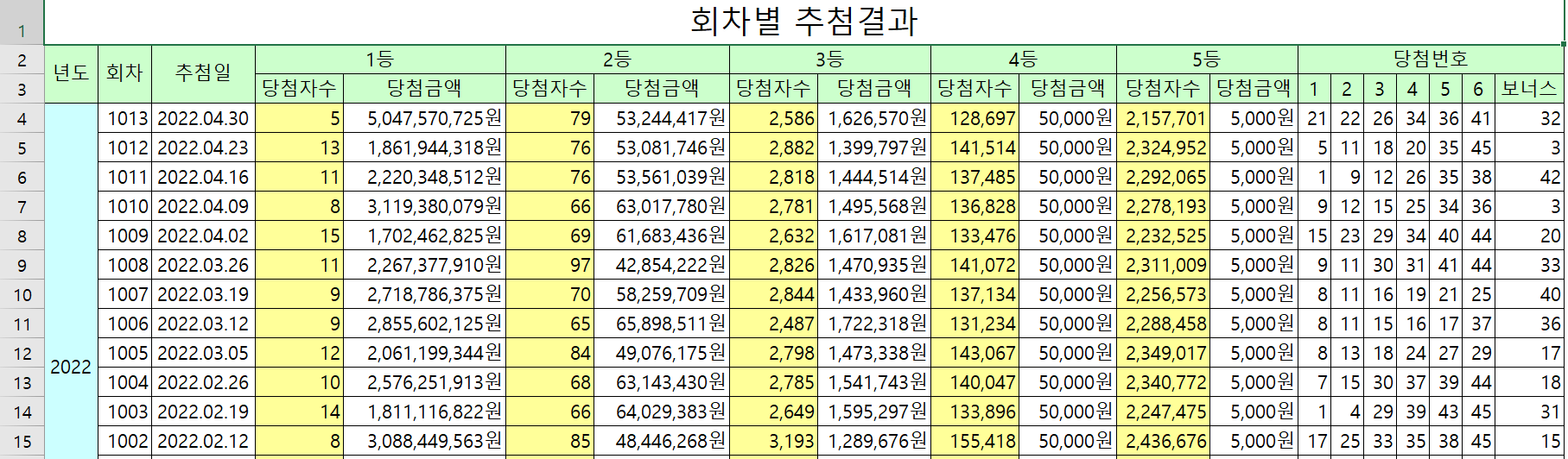 2002년도 부터 2022년도까지 1회차 부터 1013회차까지 포함되어 있습니다.