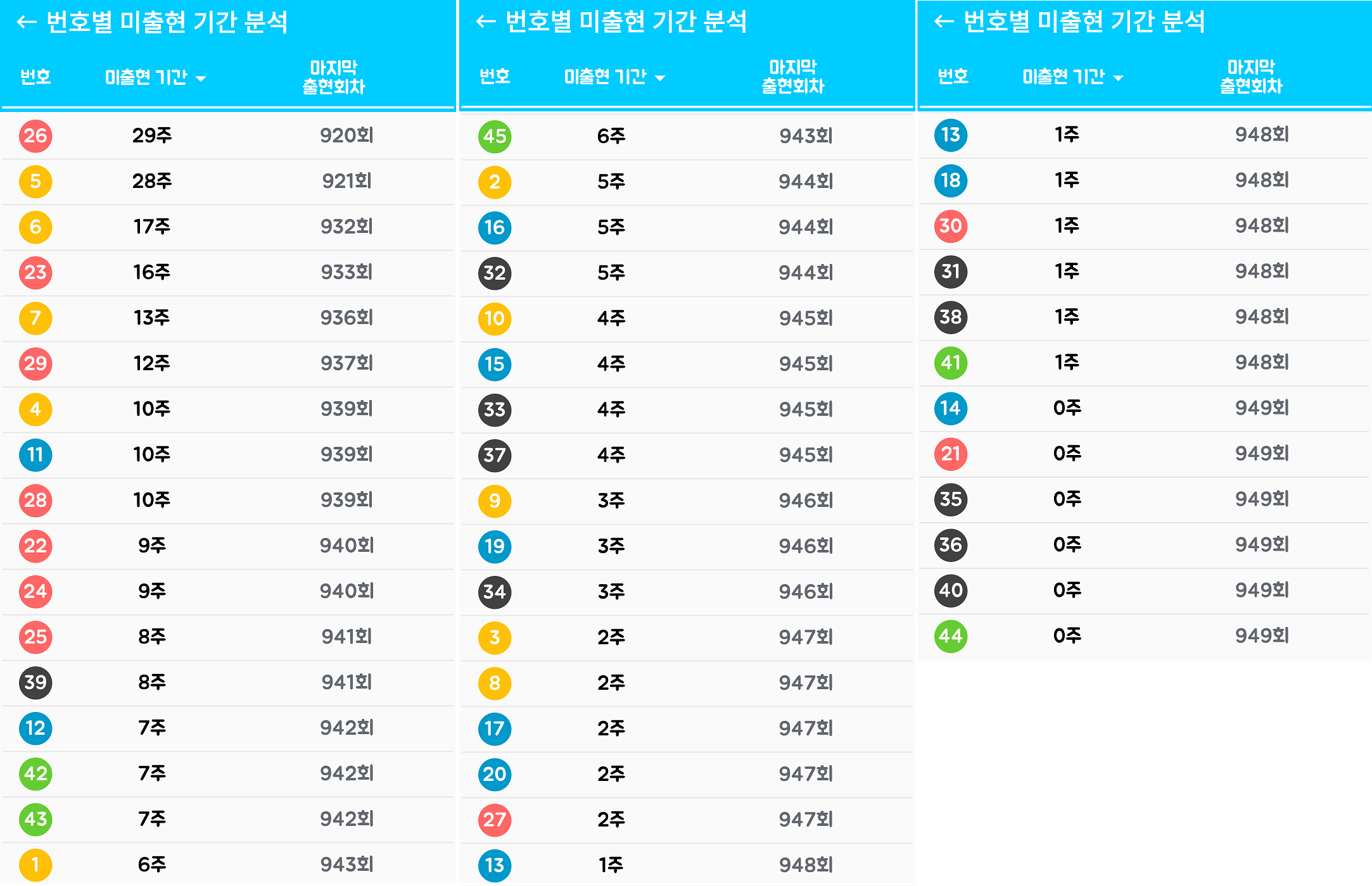 26번 번호가 920회차에 마지막으로 출현 후 29주째 미출현 중입니다. 5번의 경우 28주째 미출현하였으며 921회차에서 마지막으로 출현하였습니다.  6번은 932회차에 마지막으로 출현 후 17주째 미출현하였습니다. 23번은 933회때 마지막 출현 후 16주째 모습을 보이지 않고 있습니다. 럭키 세븐 7번은 13주째 미출현중이며, 936회차에 마지막으로 출현하였습니다. 29번은 937회차에 마지막으로 출현 후 12주째 모습을 보이지 않고 있습니다. 번호 4, 11, 28번은 10주째 미출현 중입니다.