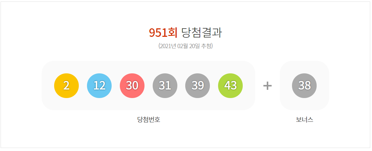 951회 로또 추첨번호는 2,12,30,31,39,43 입니다. 보너스 번호는 38입니다.