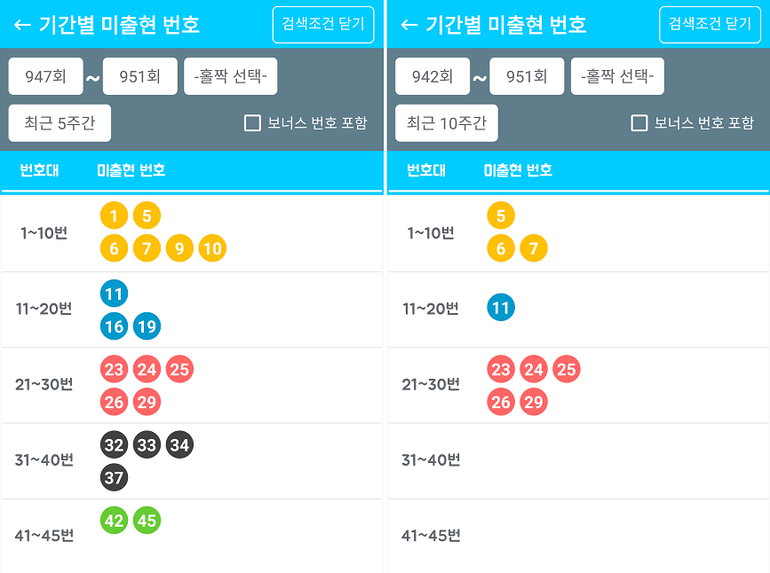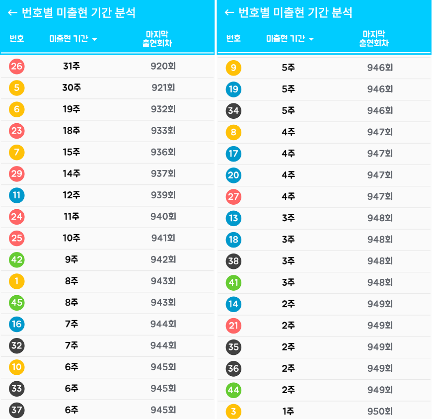 최근 5주간 미출현번호( 보너스 번호 미포함) 분석(947회~951회)